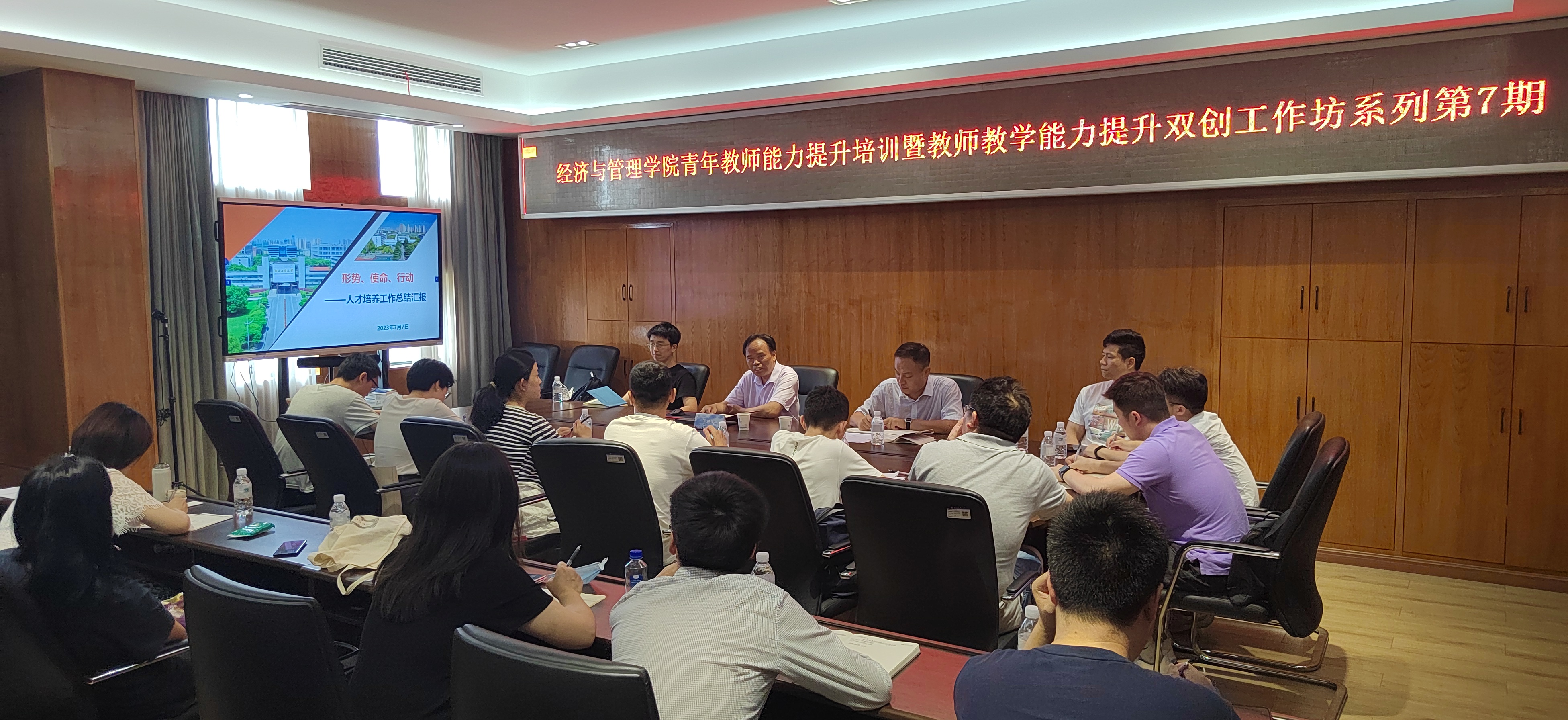 7月7日上午,经济与管理学院青年教师教学能力提升培训暨教师教学能力提升双创工作坊第七期在文科楼810会议室举行。本次讲座由学校原教务处处长王德发教授主讲,副院长张冀新教授主持会议。学院近四年来入职的30多位青年教师参加了本次专题培训。