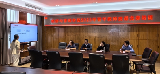 学院2023年青教赛推荐选手国贸系李向毅、会计系彭梓倩、人资系杨小婉、营商系张磊依次进行授课展示,指导老师依据选手的授课展示及教学设计文本提出改进意见,副院长熊伟结合参赛规则为选手指出了后期努力方向。