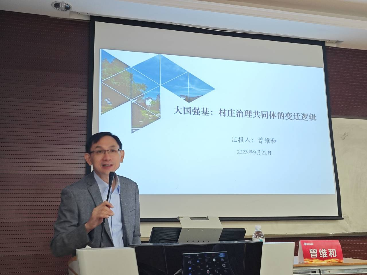 曾维和以《大国强基:村庄治理共同体的变迁逻辑》为题,从“共同体之困”与村庄治理、村庄治理共同体模式变迁、村庄治理共同体建设经验三个方面展开论述。他深入分析了发展型、维持型、瘫痪型三类村庄治理模式,对比不同治理模式下村庄的结构特征与发展走向,以南京市武家嘴村为例生动阐释了发展型村庄的成功治理经验。结合乡村振兴总体目标,他强调村庄治理共同体的成功转型需要国家权力嵌入、经济资源支持、社会资本引导和内生动力激发。