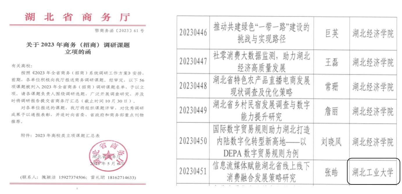 2023年6月26-10月20日期间,经济与管理学院张皓老师带领来自电商、大数据、金融、工商大类、人资、会计等6个专业的16名学生,奔赴武汉市、咸宁市、黄冈市、黄石市和襄阳市开展实地调研,共收集有效问卷514份,师生共同撰稿,形成《信息流媒体赋能湖北省线上线下消费融合发展策略研究报告》,递交湖北省商务厅。