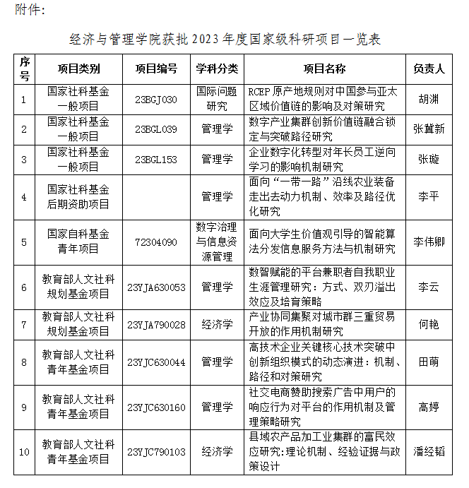 近日,2023年度国家社会科学基金项目、国家自然科学基金项目、教育部人文社会科学研究项目评审结果陆续揭晓,经济与管理学院共获批10项国家基金项目,其中国家社会科学基金项目(包括后期资助)获批4项,立项数量突破学院新高。