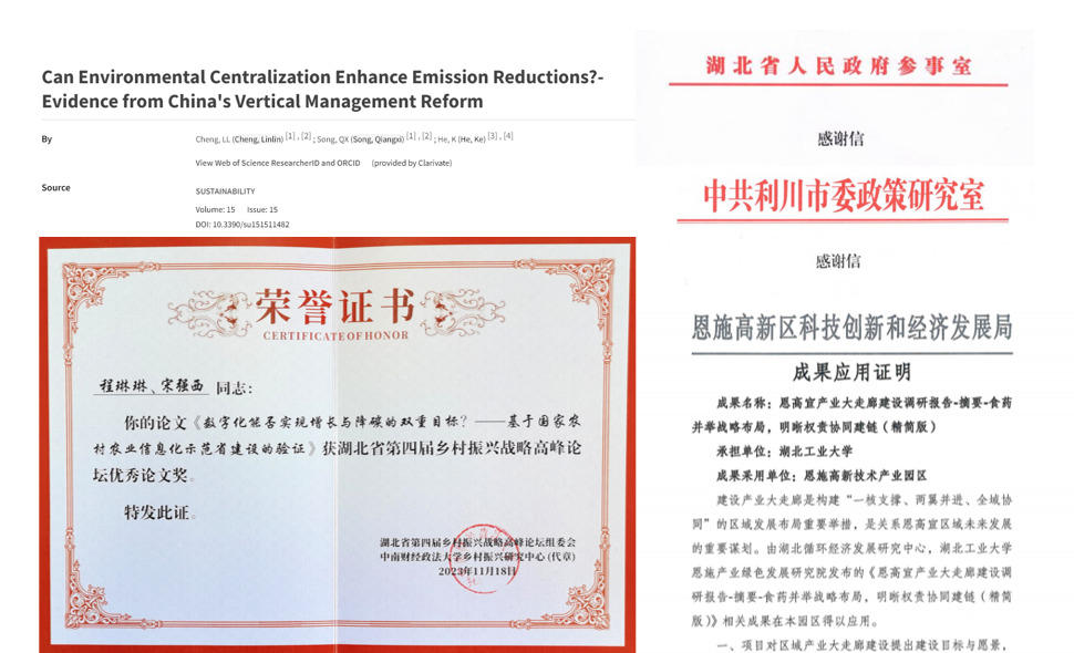 宋强西同学自入学以来,深耕绿色增长、数字经济及政策评估方向的研究,积极投入学术论文撰写、课题调研、研究报告撰写等科研工作,取得显著成果。截至目前,学术论文方面,发表SCI论文1篇,获2023年湖北省第四届乡村振兴战略高峰论坛优秀论文奖等多个奖项,另有多篇论文在投;研究报告方面,被各级政府部门采纳应用5篇,获湖北省政府有关部门感谢信表彰3次;课题项目方面,主持校级研究生科研创新基金项目1项,参与导师课题多项。同时,宋强西同学还是我院经济与管理学院研究生“巡源”沙龙创始人。