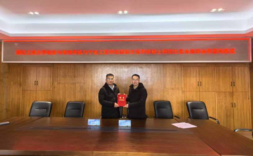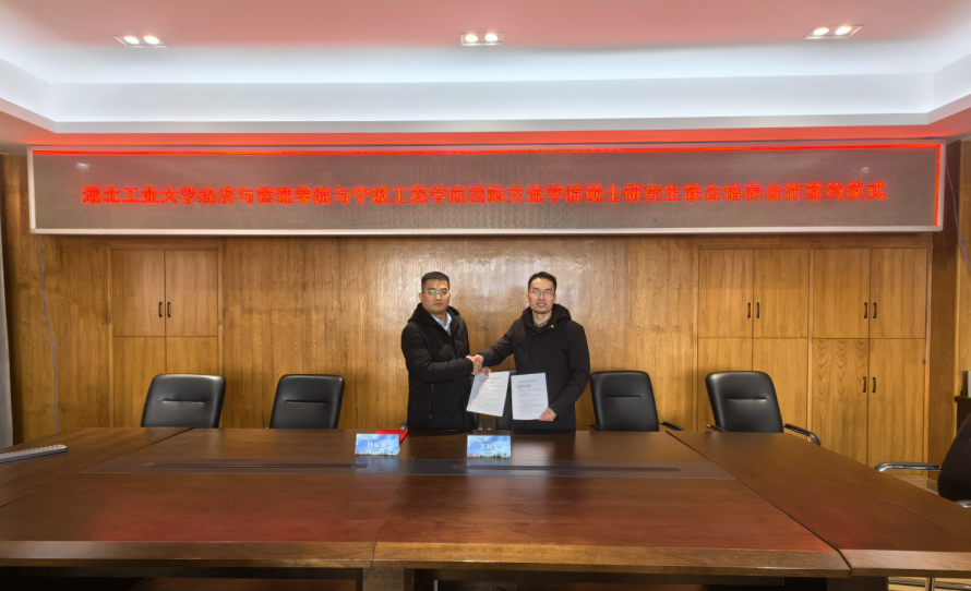 签约仪式上,王利军介绍了湖北工业大学经济与管理学院研究生培养的基本情况,杜运潮介绍了宁波工程学院国际交流学院的基本情况,双方就加强校际合作与交流、互助共进、实现研究生教育工作更好更快发展达成共识,签订研究生联合培养及生源地协议书。同时,聘任杜运潮为湖北工业大学经济与管理学院专业硕士研究生兼职导师。