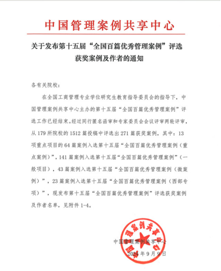 “全国百篇优秀管理案例”是我国本土案例的优秀代表,也是公认的中国管理案例最高奖项。据悉,第十五届“全国百篇优秀管理案例”共收到来自全国179所院校的1512篇投稿,经严格审核,匿名遴选和专家会审,最终入围“全国百篇优秀管理案例”重点案例64篇,一般项目141篇,微案例专项43篇,西部项目23篇。