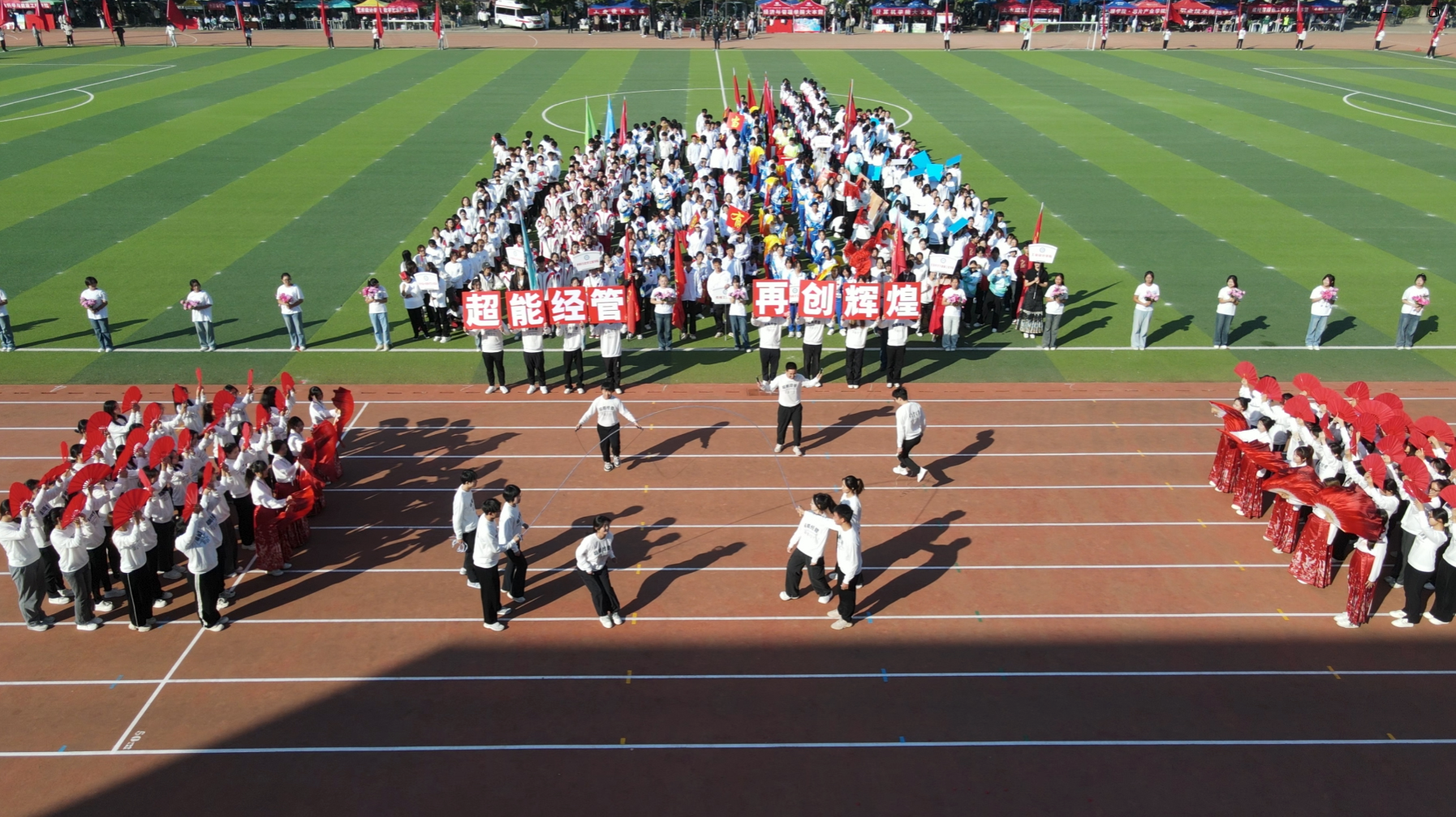 开幕式上,学院师生代表队迈着整齐的步伐进入运动场,学院领导班子全体成员参与教职工代表方阵,展示了精神饱满、积极奋进的良好状态;学生代表方阵创新设计,将中国舞元素中的“折扇”与体育项目中的“跳绳”结合,跳出了青春的旋律,展现了拼搏的姿态。
