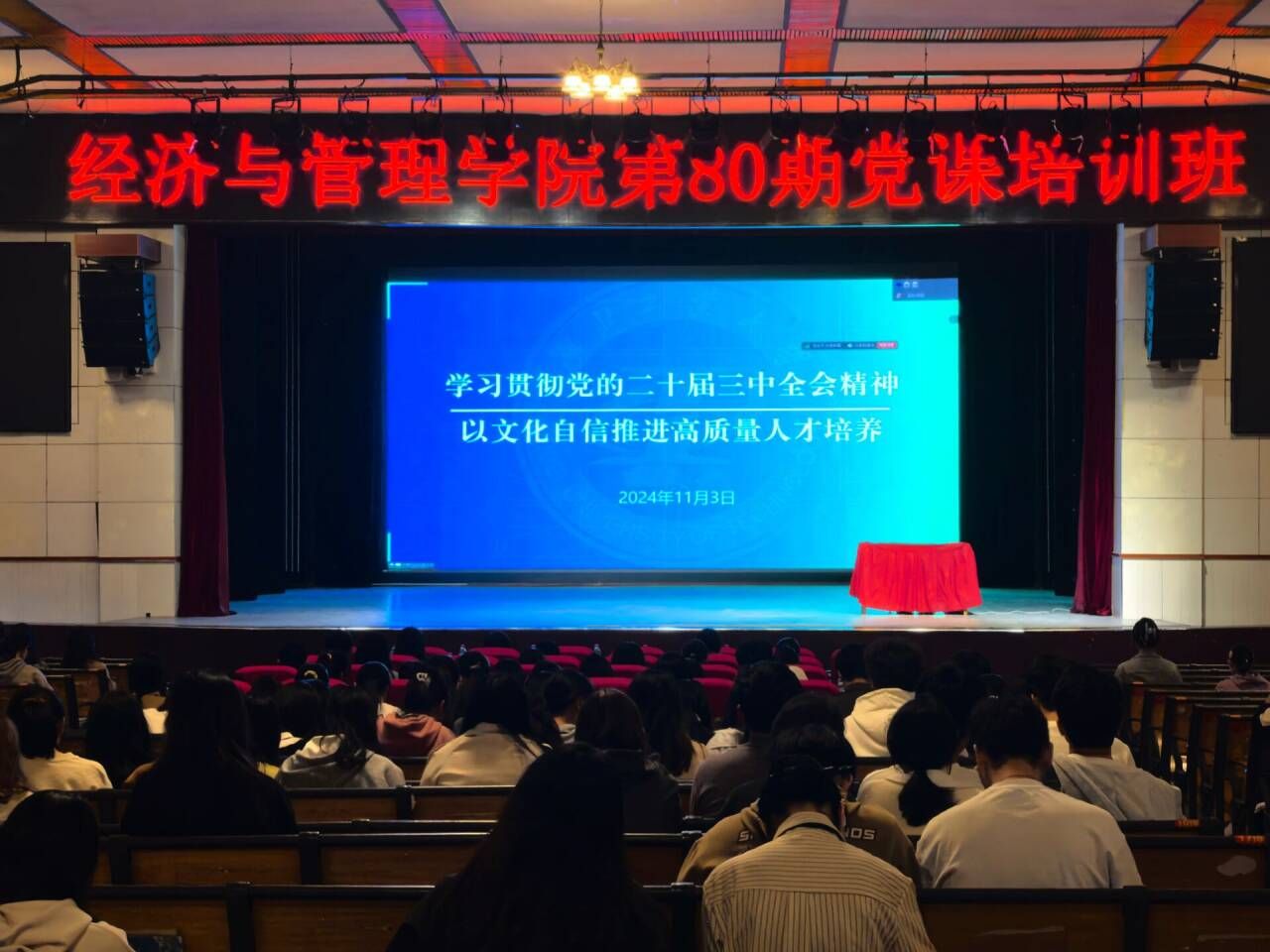 11月3日,经济与管理学院第80期党课培训班在大礼堂开班。本次培训邀请了校纪委副书记周长喜、校党委宣传部副部长徐胜、马克思主义学院李学锋、经济与管理学院党委书记彭卫、副书记余贞担任主讲人,学生党员代表叶麟、丁梓涵担任主持人。
