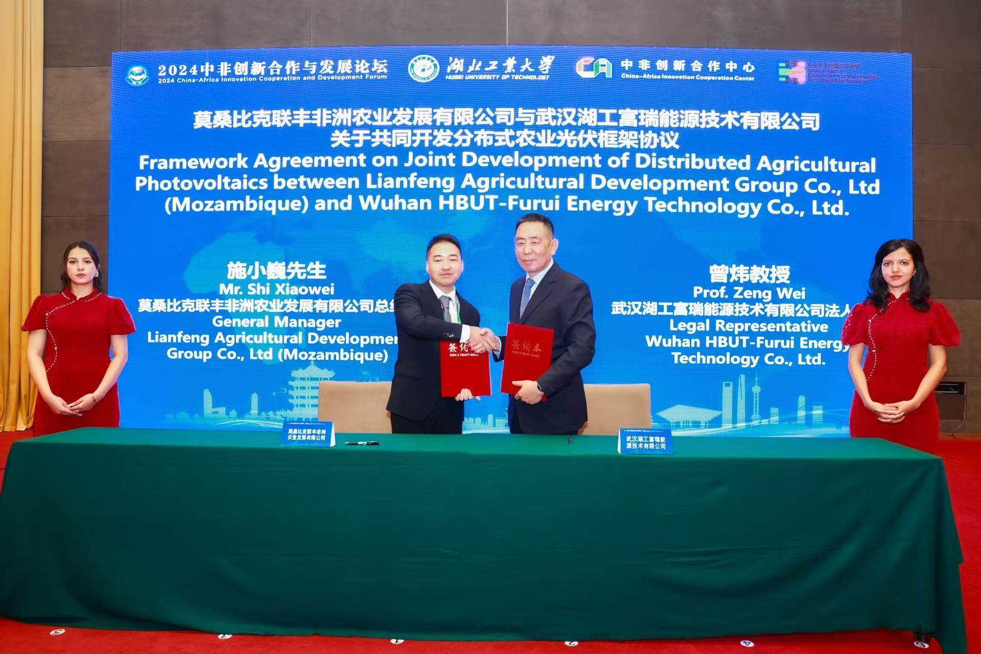 会上,我院低碳经济与技术研究中心主任、能源经济系曾炜教授代表武汉湖工富瑞能源技术有限公司与莫桑比克联丰非洲农业发展有限公司签订了关于共同开发分布式农业光伏框架协议。在项目路演环节,曾炜教授现场向各位专家、学者、企业代表介绍了中国光伏产业发展、构网型电站、光储直柔,并表达了向非洲实现可再生能源及并网光伏电站项目技术转移的意愿。