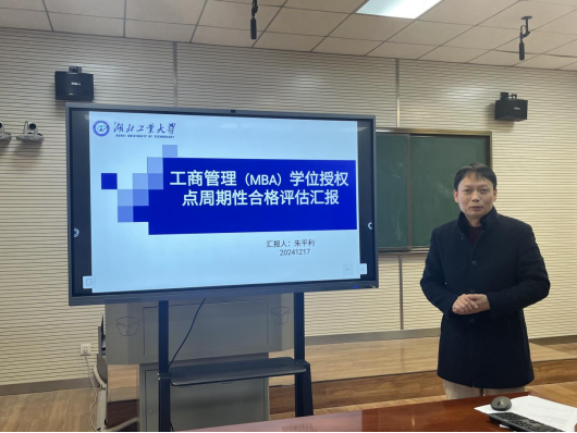 12月17日,湖北工业大学经济与管理学院工商管理硕士MBA专业学位点周期性合格评估自评会在文科楼311会议室举行。湖北省教育厅学位办原主任韩习祥,教育部工商管理学科专业教指委委员、武汉大学李燕萍教授,华中科技大学张毅教授,中南财经政法大学陈池波教授,长江通信集团董事长熊向峰受邀担任专家开展评估。校党委常委、副校长宋小春出席评估会,经济与管理学院党委书记彭卫、院长孙浩、副院长张冀新、熊伟、王利军,学位点负责人、硕导代表、研究生教育管理人员、研究生代表参加会议。