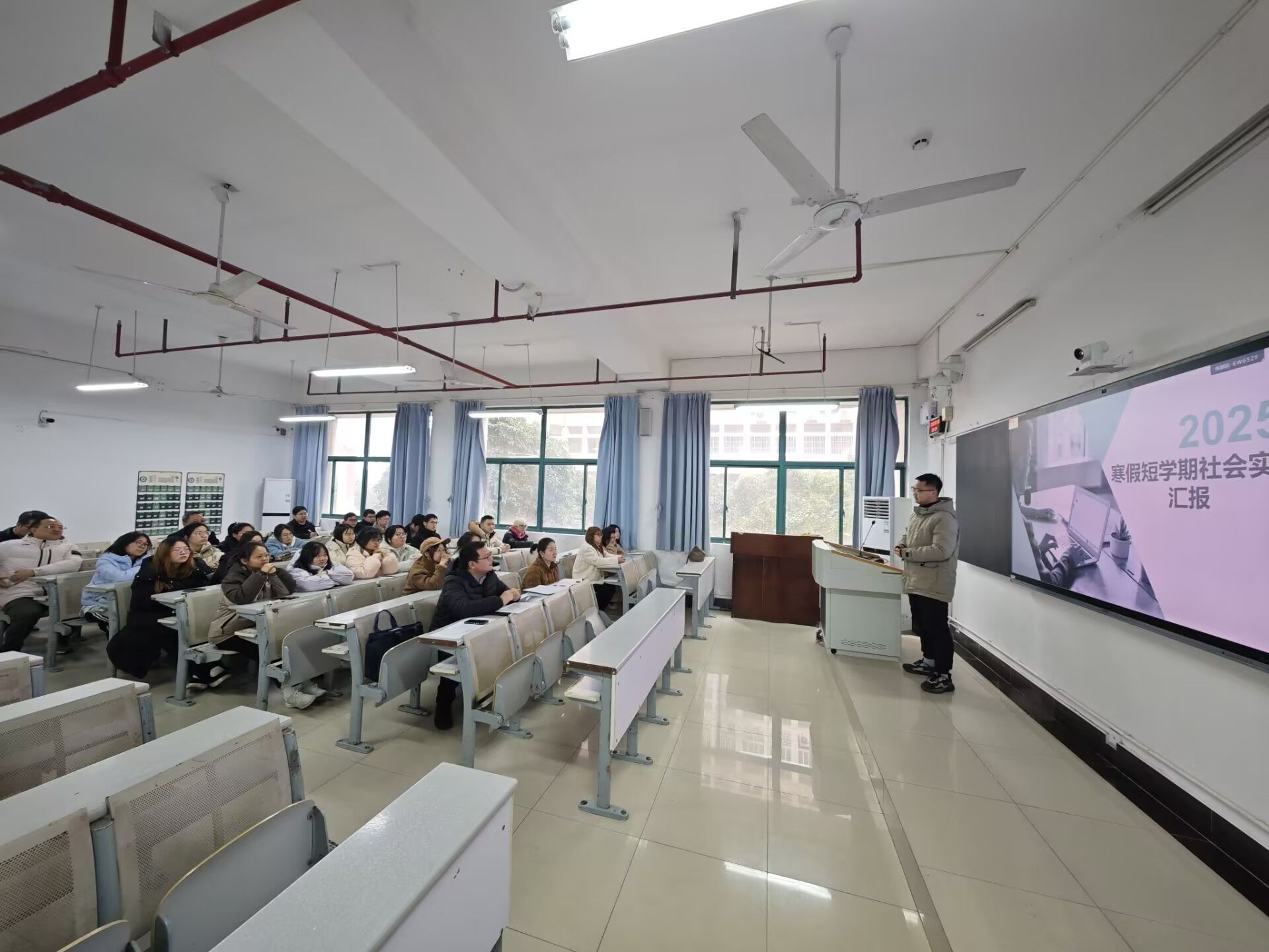 本次短学期社会实践经管学院共有73个班级共计2300余名学生参与。彭育园走访3教寒假短学期实践答辩现场,观摩了23电商1班的答辩过程,认真听取学生围绕工业园区实习、商超零售实践等主题的汇报,并对学生立足专业、扎根实践的创新思维和务实精神给予充分肯定。