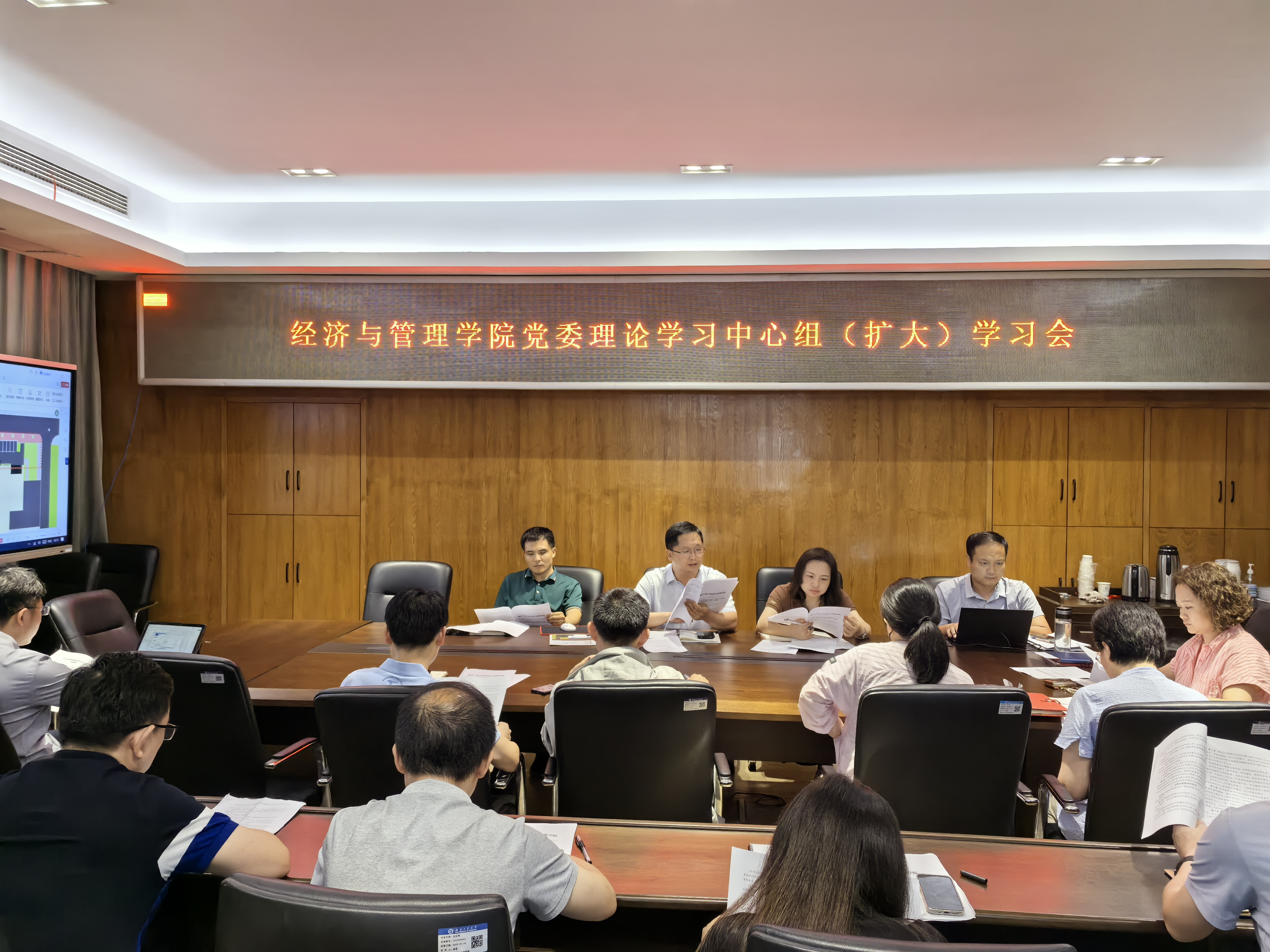 5月22日下午,经济与管理学院2025年第4次党委理论学习中心组(扩大)学习会议在文科楼810会议室召开。学院全体领导班子成员、党委委员及全体中层干部参加此次学习,会议由院党委书记彭卫主持。