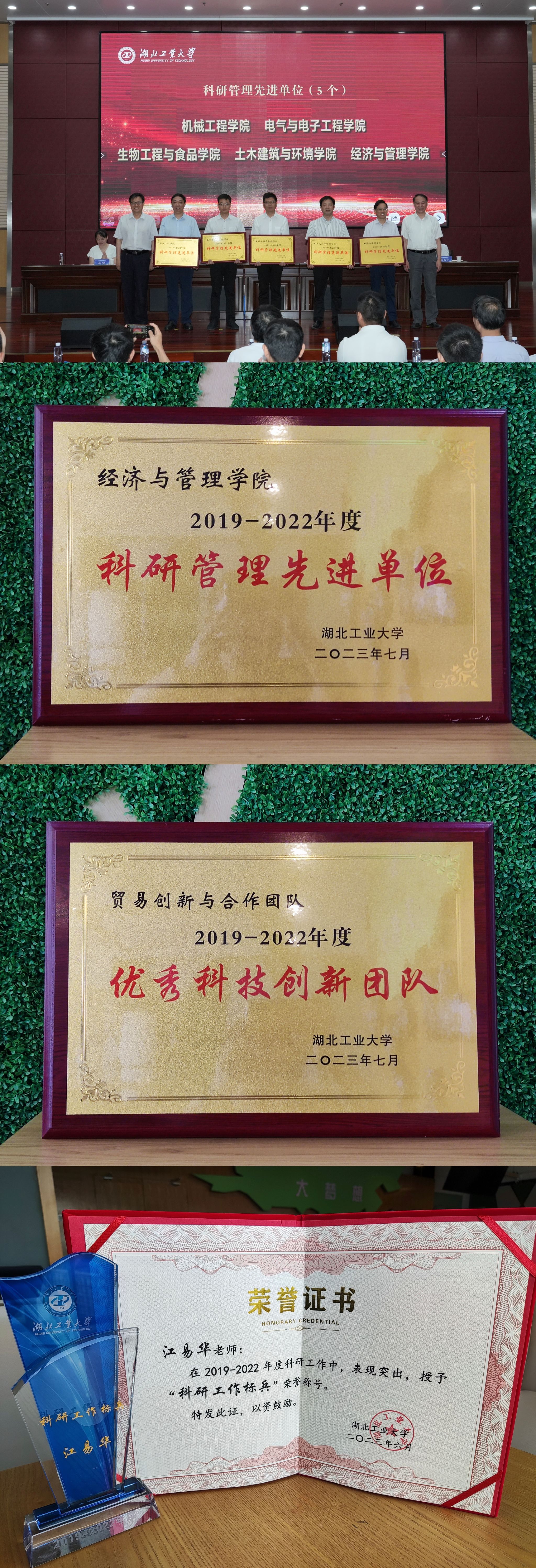7月7日上午,湖北工业大学2023年科技创新大会在图书馆报告厅召开,会议全面总结2019-2022年度学校科技创新工作所取得的成绩,表彰近年来科技创新战线涌现出来的先进集体和先进个人。全校共有5个教学单位、10个PI团队、9名科技工作者受到表彰。经济与管理学院被评为“2019-2022年度科研管理先进单位”,李平副教授负责的贸易创新与合作团队被评为“2019-2022年度优秀科技创新团队”,江易华教授被评为“科研工作标兵”。