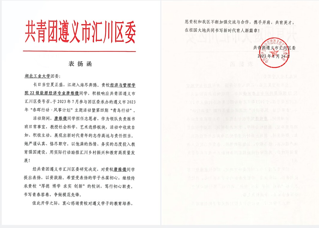 “她积极主动,展现出新时代青年的志存高远与责任担当。她严谨认真、恪尽职守,以饱满的热情、务实的态度投入教育强国建设,用实际行动助推汇川乡村振兴和教育高质量发展!”这是一封来自共青团遵义市汇川区委的表扬信,信中表扬的这位同学正是湖北工业大学经管学院22能源1班学生唐维微。
