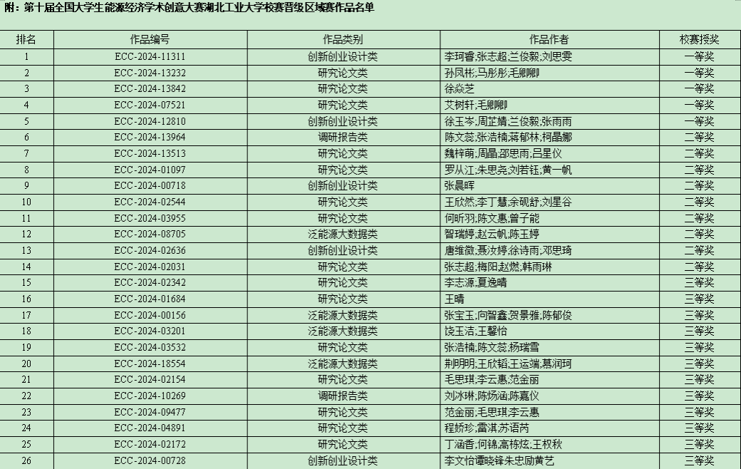 第十届全国大学生能源经济学术创意大赛湖北工业大学校赛晋级区域赛作品名单公示