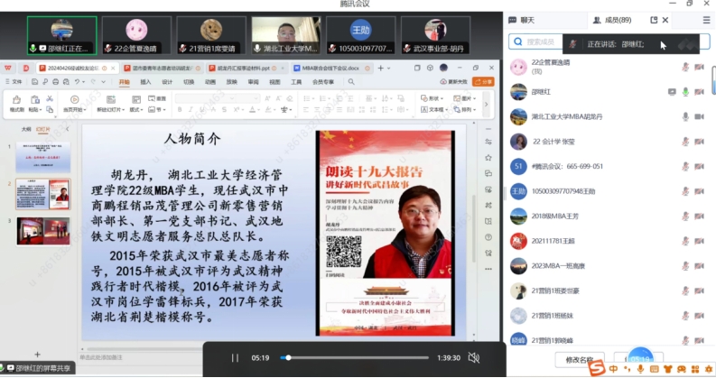 本次论坛主讲人22级MBA学生胡龙丹,现任武汉市中商鹏程销品茂管理公司新零售营销部部长、第一党支部书记、武汉地铁文明志愿者服务总队总队长。2015年荣获武汉市最美志愿者称号,2015年被武汉市评为武汉精神践行者时代楷模,2016年被评为武汉市岗位学雷锋标兵,2017年荣获湖北省荆楚楷模称号。