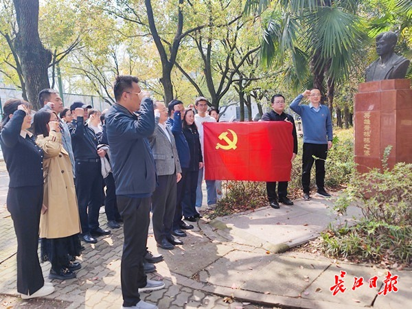 清明前夕,萧栋栋党支部成员瞻仰英雄雕像,追思校友事迹,对着党旗许下庄严承诺。 记者汪洋 摄