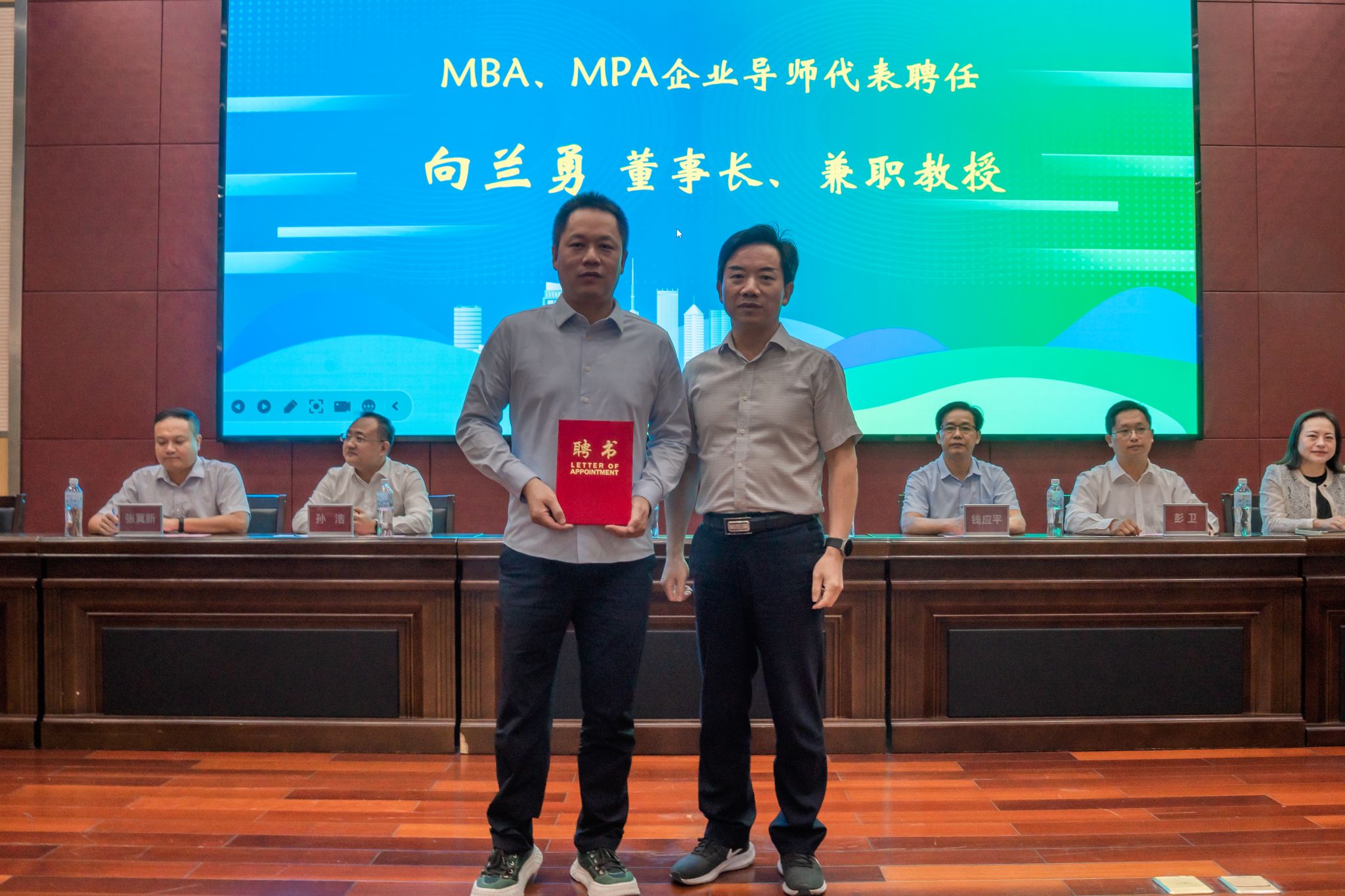 在开学典礼大会上,举行了硕士研究生导师聘任仪式,聘请向兰勇为湖北工业大学工商管理学科兼职硕士研究生导师,宋小春为向兰勇颁发了聘书。