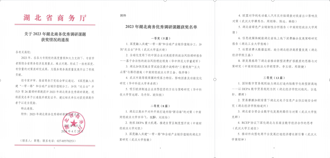 近日,湖北省商务厅公布了优秀调研课题获奖结果,我校经济与管理学院张皓老师的课题《信息流媒体赋能湖北省线上线下消费融合发展策略研究报告》获评优秀调研课题二等奖。