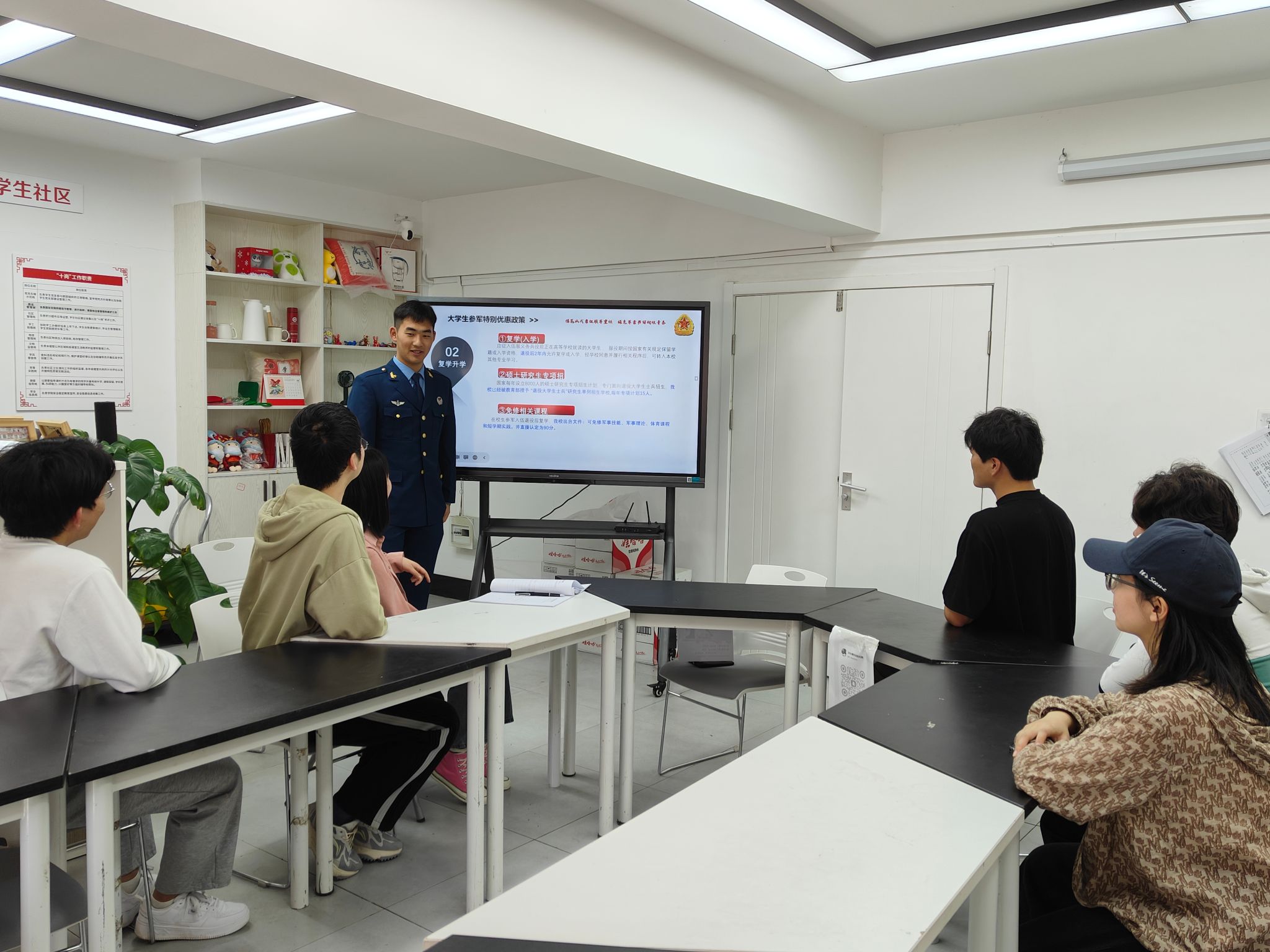报告会前,学院“薪火”退伍大学生志愿服务队在“一站式”学生社区为同学们开展征兵咨询和服务工作,用自己在部队的经历和故事引导更多的同学了解部队、热爱部队、献身国防。
