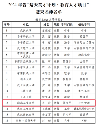 近日,中共湖北省委人才工作领导小组办公室、湖北省教育厅公布了2024年省“楚天英才计划·教育人才项目”楚天名师名单,经济与管理学院院长孙浩教授获得“楚天英才计划·教育人才项目”楚天名师(以下简称“楚天名师”)荣誉称号。