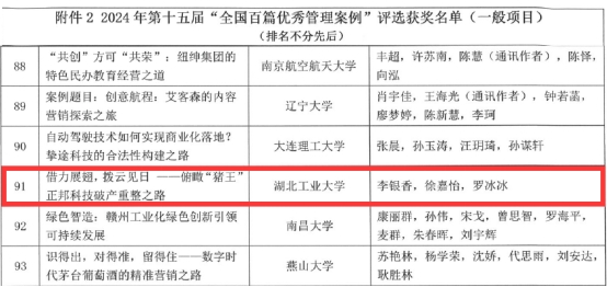 近日,由全国工商管理专业学位研究生教育指导委员会指导、中国管理案例共享中心主办的第十五届“全国百篇优秀管理案例”评选结果揭晓。经济与管理学院会计系李银香教授团队撰写的《借力展翅,拨云见日——俯瞰“猪王”正邦科技破产重整之路》(作者:李银香、徐嘉怡、罗冰冰)成功入选。这是我校首次入选全国“百优案例”,这标志着研究生案例研究与开发工作上了一个新台阶。