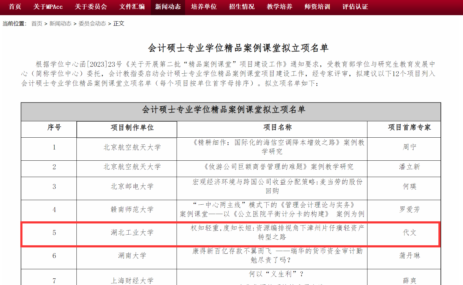 经济与管理学院一直十分注重教学案例的教学与研究工作,已开发典型案例20余篇,其中16篇成功入选中国管理案例共享中心案例库,3篇入选会计硕士专业学位案例库。此次项目入选对提升经济与管理学院教师案例开发质量、提高经济与管理学院案例教学水平将产生较大的促进作用。