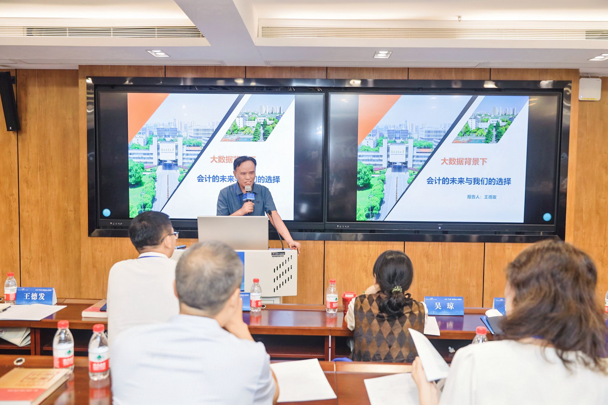 会计系教授王德发代表学院在分论坛作题为《大数据背景下会计的未来与我们的选择》的交流发言。他指出,“大数据+人工智能”驱动了产业升级与重构,并从“新工程教育转型”“多学科交叉融合”“有使命感的学习”三个方面驱动了高校教育变革,这会对会计师的未来发展产生多维度的影响,未来会计师应具备“懂技术、精业务、会管理”的高水平综合素质。基于以上变革,他进一步分享了本校会计专硕培养在责任与使命、多学科交叉与融合、产教融合等方面的践行经验,尤其是会计专硕培养“绿色化、数智化、国际化”方面的特色。