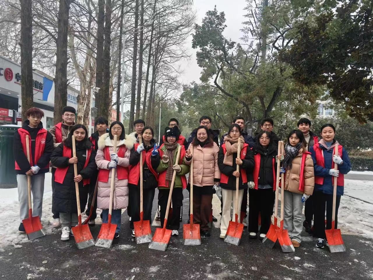 同时,学院学工办积极行动,党委副书记余贞带领萧栋栋青协的师生们在校园主路、学生宿舍园区等开展了扫雪除冰活动,为学生平安返校做好服务保障。