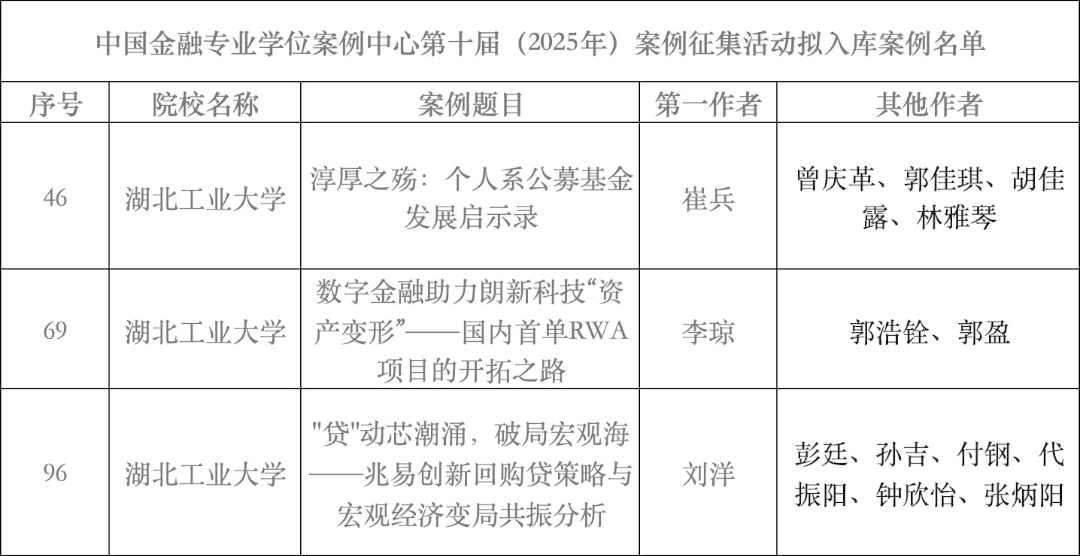 据悉,本届大赛竞争激烈,共收到全国有效投稿案例852篇,最终仅有171篇案例脱颖而出,获准入库。我院教师积极参与,精心组织投稿8篇。经过严格评审,我院金融系3篇高质量案例成功入选。尤为可喜的是,我校入选案例数量在湖北省高校中高居榜首,与武汉理工大学和武汉纺织大学并列第一。
