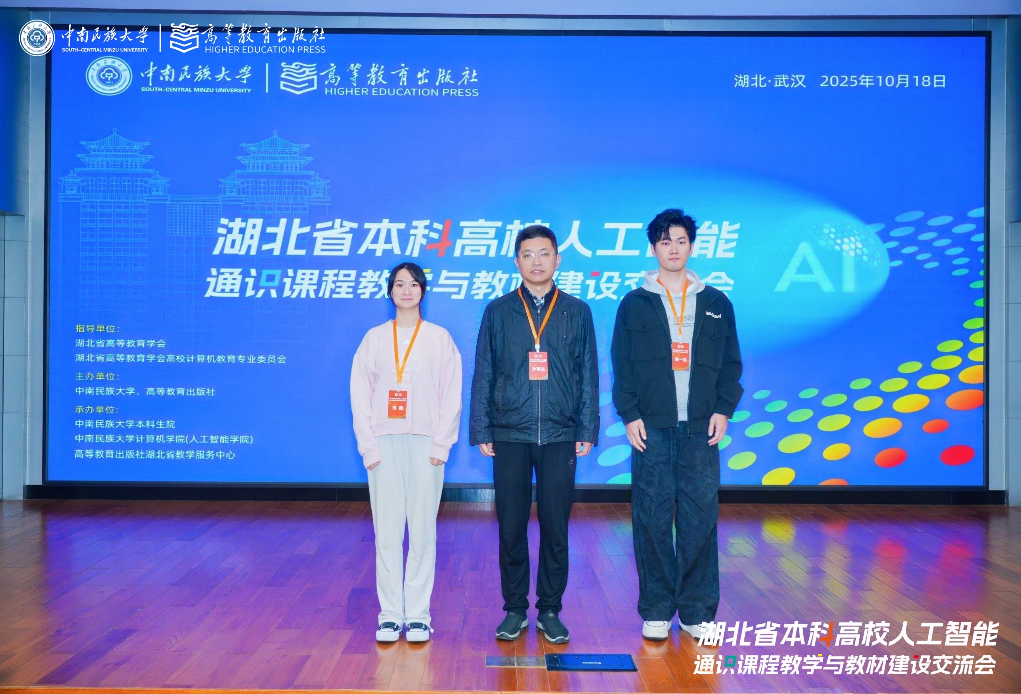 2025年10月18日,由中南民族大学、高等教育出版社共同主办,中南民族大学承办的“湖北省本科高校人工智能通识课程教学与教材交流会”在湖北武汉召开。本次会议汇聚了全国150余位专家学者、教学管理者及一线教师。学院院长助理、信息管理系孙雨生教授带领硕士研究生范颖、赵一龙参加了此次会议。