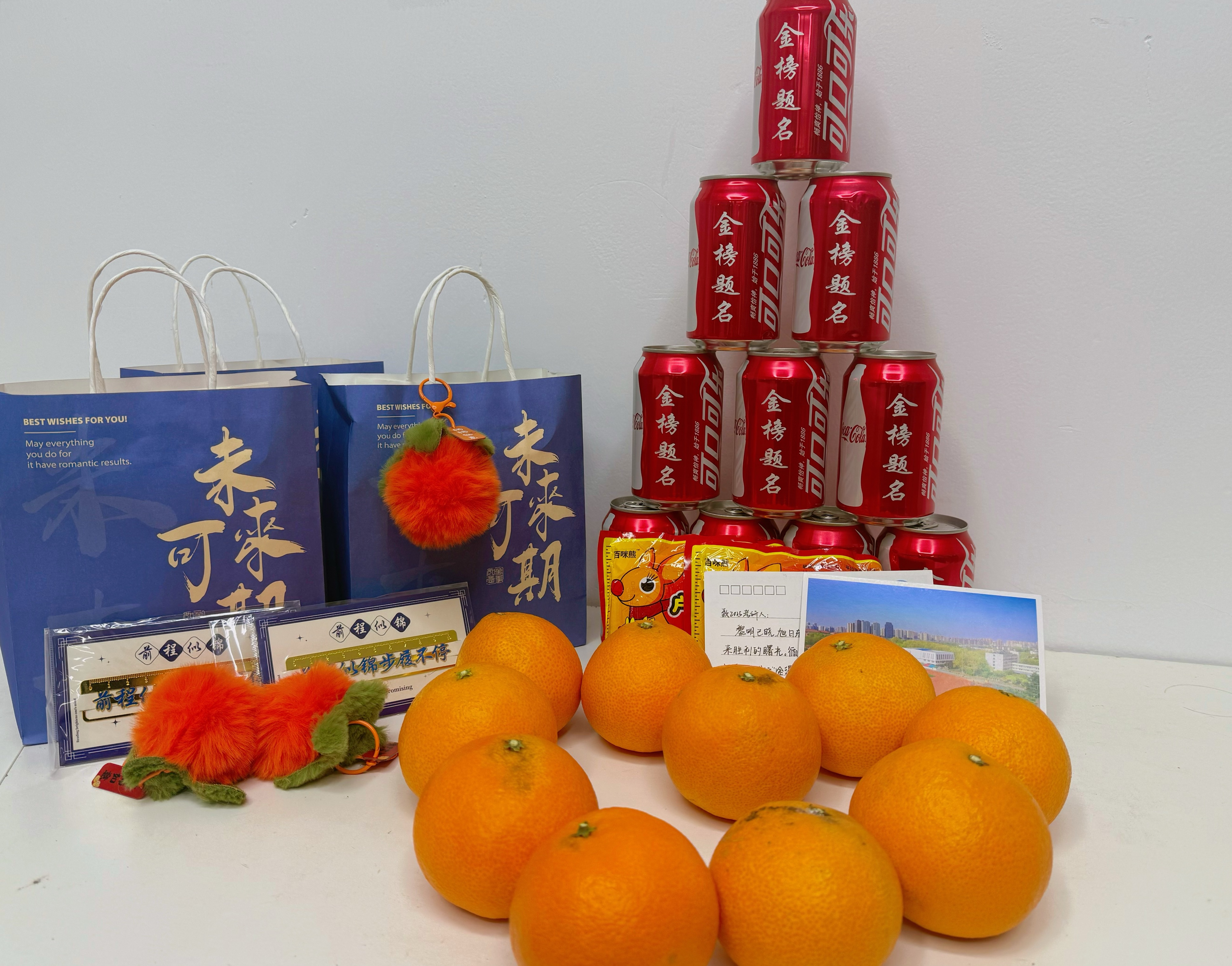 学院精心策划、积极筹备,为“研”途追梦人量身打造了“金榜题名”上岸加油礼包。礼包内不仅有寓意美好的“心想事‘橙’”果冻橙、象征“旗开得胜”的“金榜题名”汽水、印着励志语录的“前程似锦”书签,还有在寒冬中传递温暖的“暖心”暖手宝,更饱含温情的是一封封来自低年级学弟学妹们手写的祝福明信片,每一份心意都凝聚着学院对学子们的真挚关怀与殷切期望。