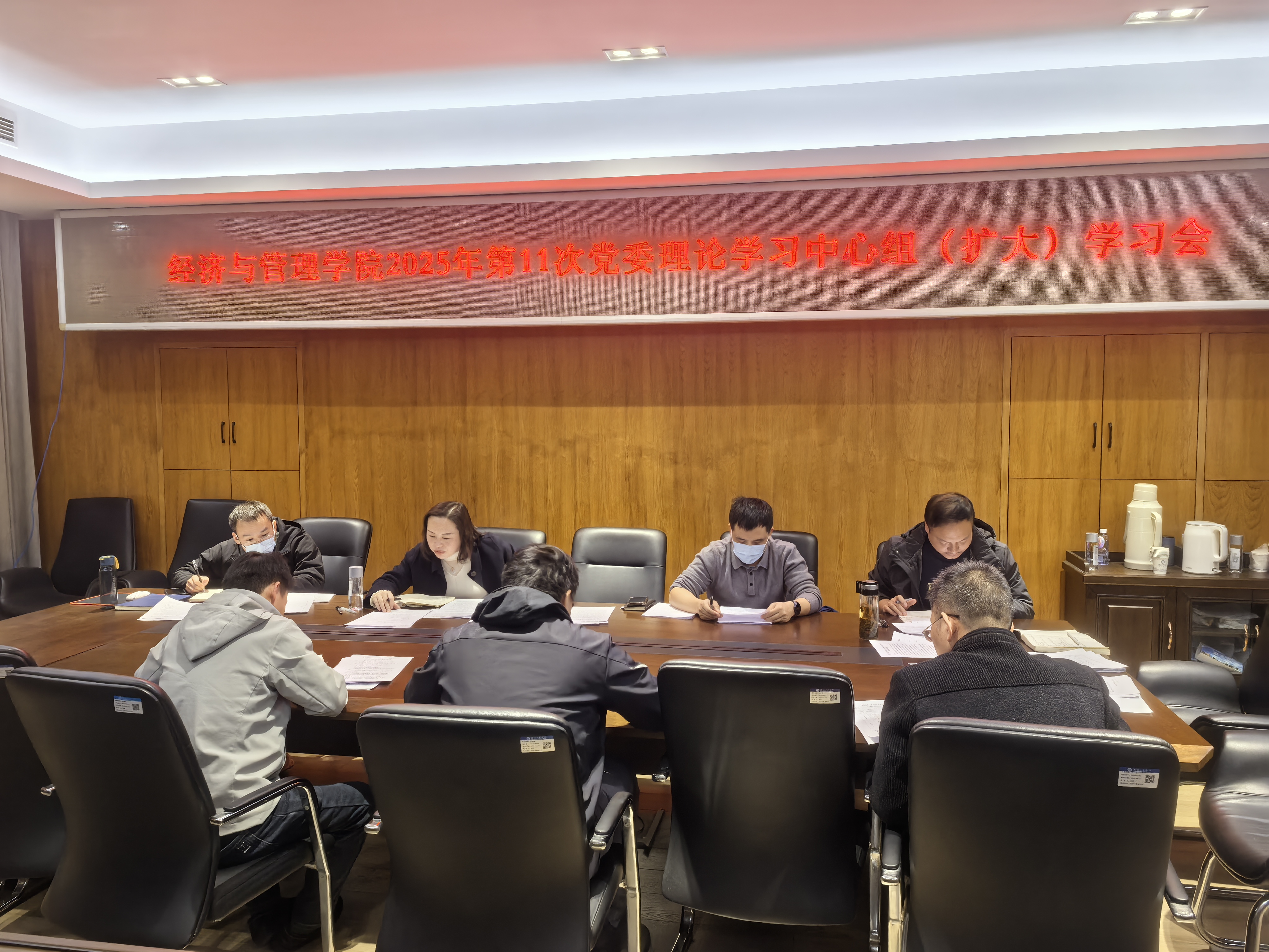 11月25日下午,经济与管理学院党委在文科楼810会议室举行2025年第11次党委理论学习中心组(扩大)学习会。学院领导班子成员、党委委员和院长助理参加了本次学习会,学院党委副书记余贞主持会议。