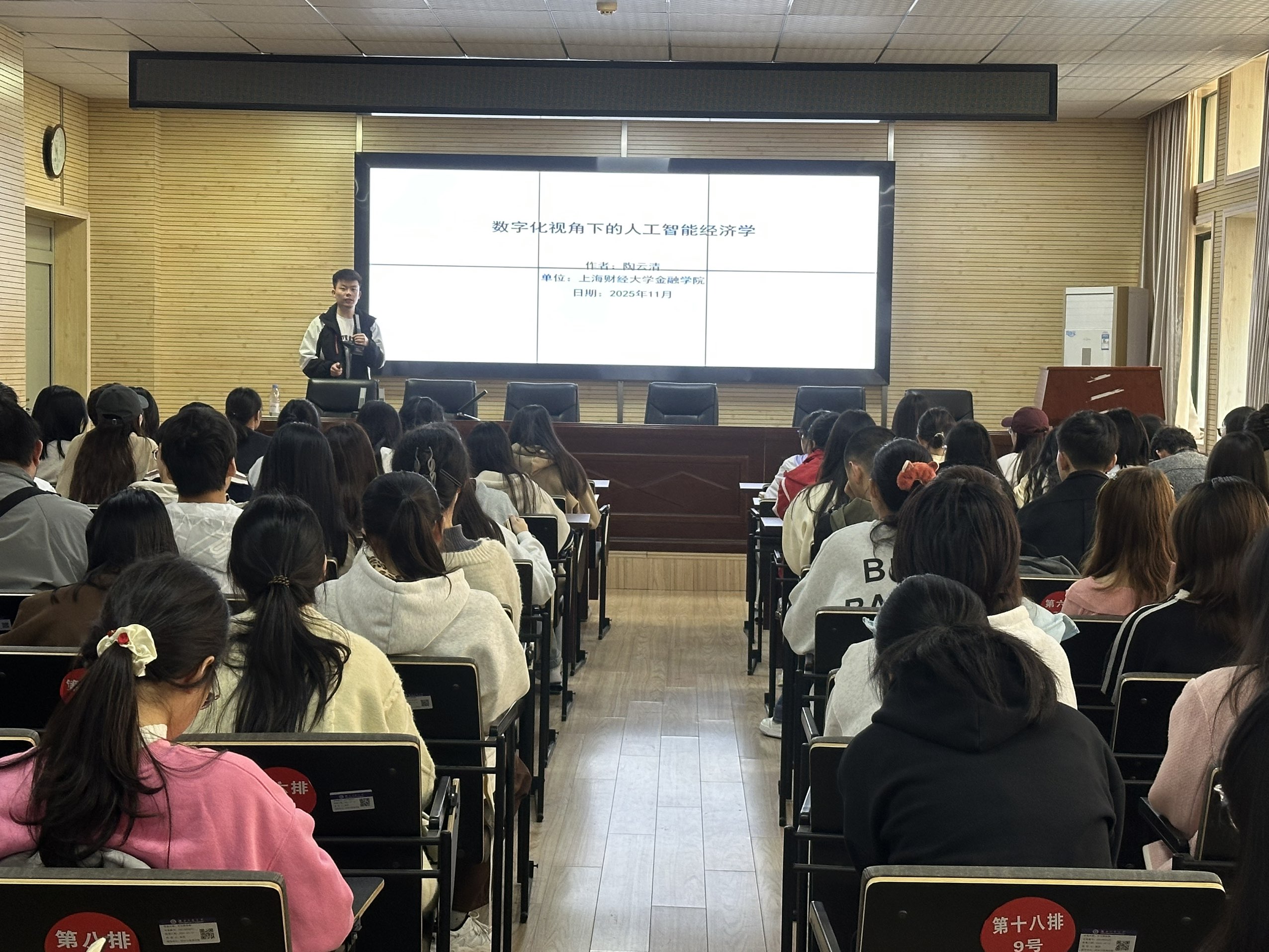 2025年11月14日下午,经济与管理学院40周年学术院庆之际,金融系特别邀请优秀校友、上海财经大学金融学院青年教师陶云清返校,在学院分享主题为《数字化视角下的人工智能经济学》的专题讲座。讲座由金融系书记彭廷老师主持,学院部分教师、本硕学子齐聚现场,共赴这场学术与成长的盛宴。