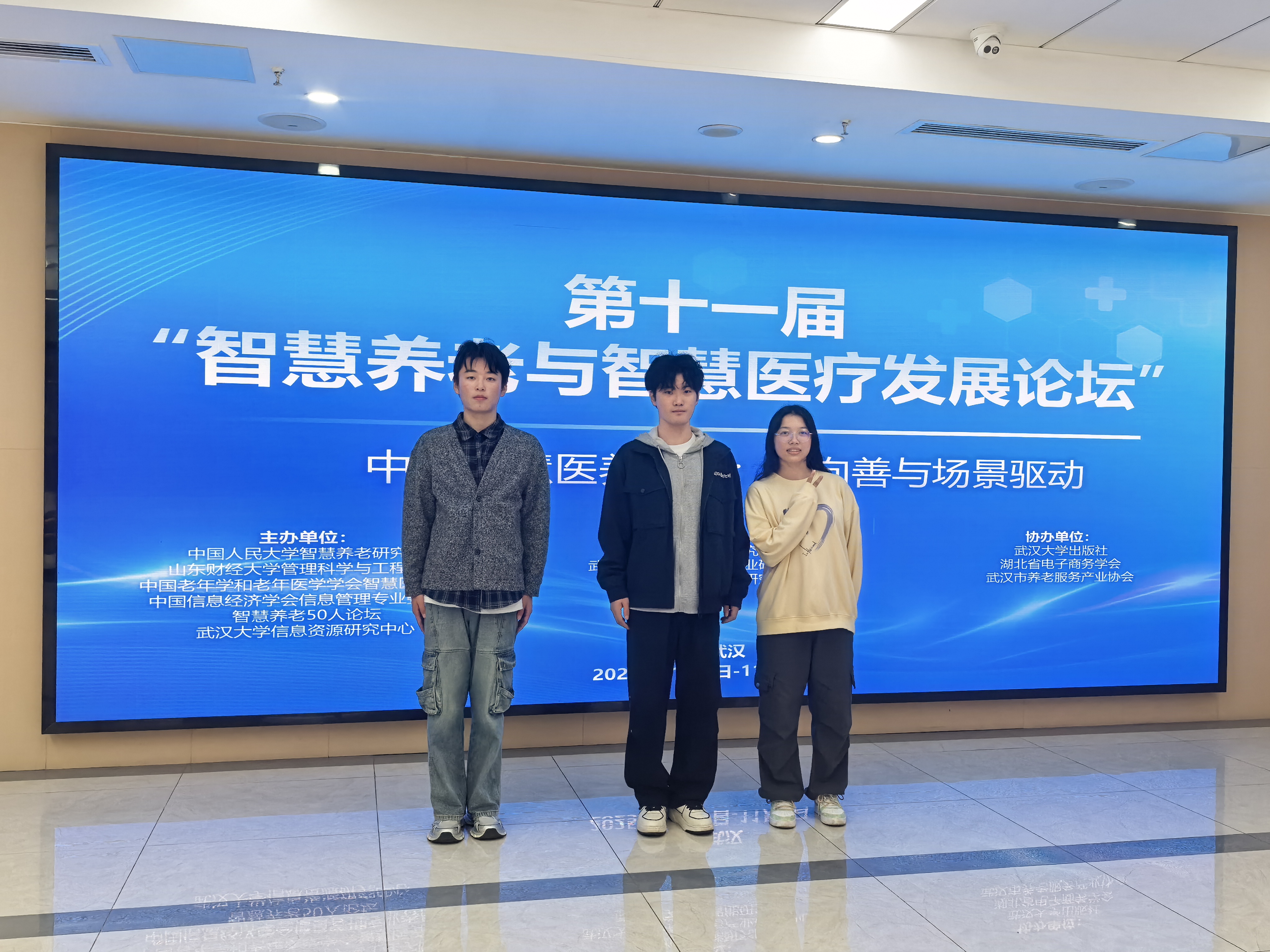 2025年11月7日至9日,由中国人民大学智慧养老研究所、山东财经大学管理科学与工程学院、中国老年学和老年医学学会智慧医养分会、中国信息经济学会信息管理专业委员会、智慧养老50人论坛及武汉大学信息资源研究中心共同主办的第十一届“智慧养老与智慧医疗发展论坛”在武汉大学召开。来自全国高校、科研院所和企业的百余位专家学者围绕人工智能技术在智慧养老与医疗领域的创新应用与发展路径这一主题进行了深入讨论。经济与管理学院2025级国际商务专业硕士生赵一龙与25级大数据管理与应用专业本科生陈世睿、陈金莉一起参加了此次论坛。
