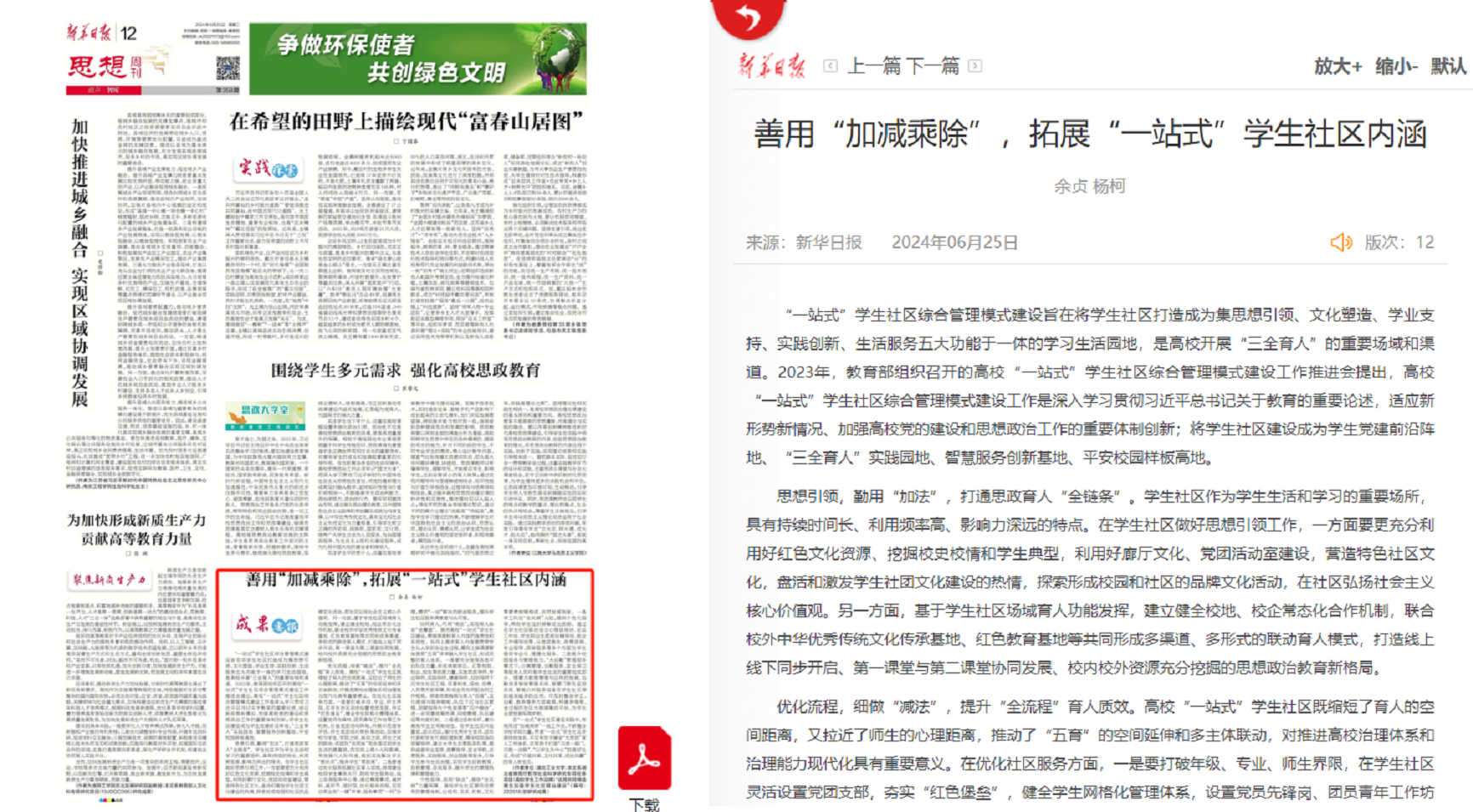 2024年6月25日出版的《新华日报》理论版栏目“思想周刊·智库”刊发我院教师余贞、杨柯的理论文章《善用“加减乘除”,拓展“一站式”学生社区内涵》。
