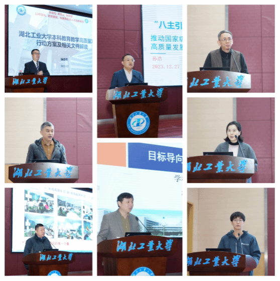 上午的会上,教务处处长张道德作了题为《湖北工业大学本科教育教学高质量发展行动方案及相关文件解读》的本科教学工作报告,就学校新一轮审核评估工作实施方案和学校本科教育教学高质量行动方案进行解读,对人才培养方案和教育教学改革工作及相关教学制度文件的变化做了说明。经济与管理学院院长孙浩、工业设计学院院长邓卫斌、材料与化学工程学院院长李学锋、机械工程学院副院长聂磊、艺术设计学院教师代表黄燕妮、中国国际大学生创新大赛金奖团队教师代表陈辉和学生代表张志超分别从一流专业建设、一流课程建设、专业认证工作、学科竞赛工作、短学期实践指导等方面进行了经验交流。