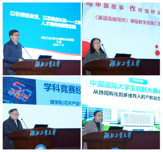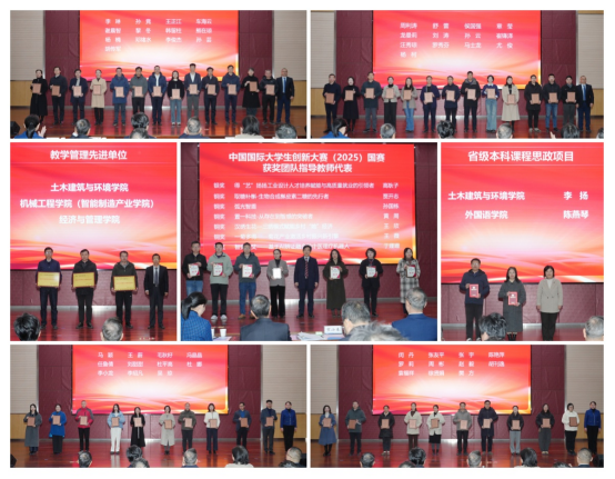 大会对在2025年教学管理、本科质量工程建设、一流专业与课程建设、课程思政项目实施、学科竞赛组织等工作中取得显著成绩的集体与个人,以及审核评估迎评促建工作中的先进个人予以表彰。土木建筑与环境学院院长马强教授、外国语学院陈燕琴副教授、理学院副院长耿亮教授、创新创业学院高耿子副教授分别就教学管理、教学改革、学科竞赛组织及创新大赛指导等方面交流分享了宝贵经验。
