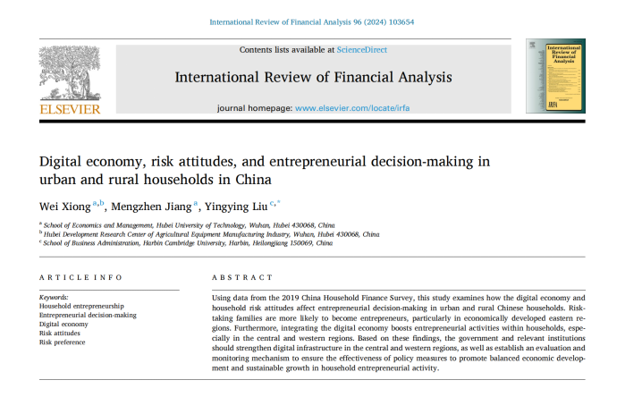 论文信息如下:Xiong, W., M. Jiang and Y. Liu, Digital economy, risk attitudes, and entrepreneurial decision-making in urban and rural households in China. International Review of Financial Analysis, 2024. 96: p. 103654.